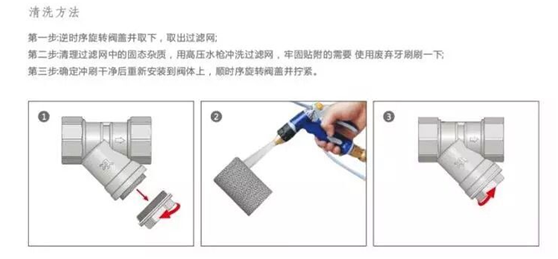 地暖每年在使用前應清洗一次過濾器。具體方法如下:首先關(guān)閉連接導管的進、回水閥門,然后打開過濾器、過濾網(wǎng)并清洗干凈,檢查過濾網(wǎng)有無破損及堵塞。如有損壞,應換上同規(guī)格的過濾網(wǎng),按原樣裝好即可。