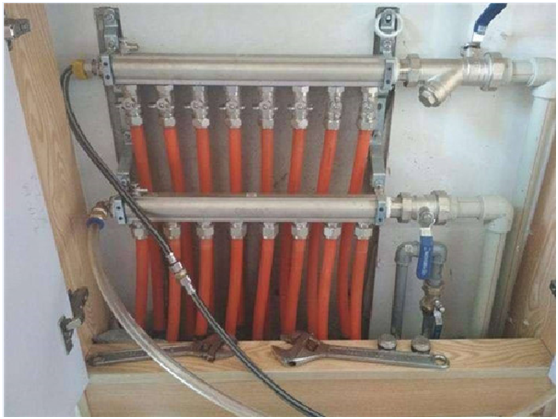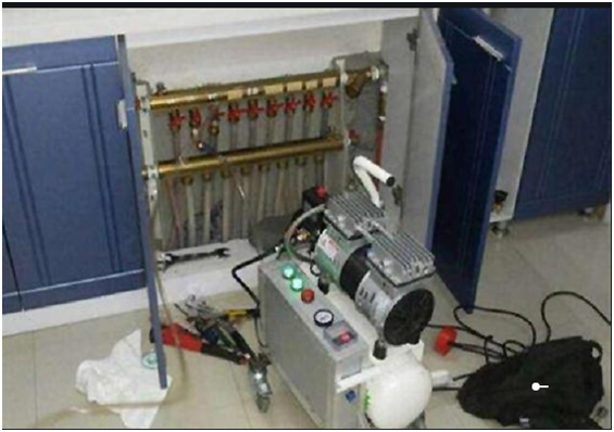 這種地暖清洗方法不需藥劑,不拆卸地暖管,清洗較徹底。其獨特的清洗原理可同時清洗地暖分集水器主管路及閥門,避免長期結(jié)垢導致閥門堵塞現(xiàn)象。這種清洗方法的不足之處在于,施工時受空間限制,特別是某些用戶的地暖分集水器安裝在隱蔽處,且分集水器兩端與墻壁距離過近,從而使施工更加困難。
