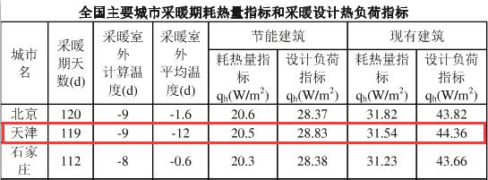根據(jù)《全國主要城市采暖期耗熱量指標(biāo)和采暖設(shè)計熱負(fù)荷指標(biāo)》,天津地區(qū)節(jié)能建筑每平方米采暖季供暖所需熱量為28.83w/㎡*24h*119d/1000≈82.34kwh/㎡