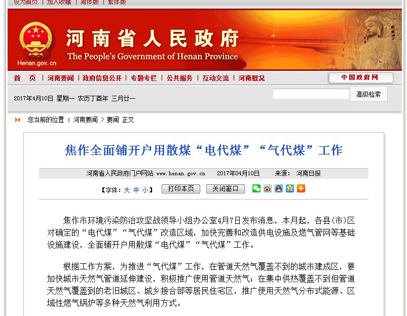 報道中具體談到“(焦作)要求10月底前,市、縣兩級建成區(qū)范圍內(nèi),嚴禁新建燃煤鍋爐,嚴禁燃煤散燒。在未實現(xiàn)集中供熱的區(qū)域應(yīng)加快集中供熱管網(wǎng)延伸,優(yōu)先發(fā)展集中供熱,其余供熱管網(wǎng)無法覆蓋區(qū)域,按照宜氣則氣、宜電則電的原則,完成省下達的“電代煤”“氣代煤”改造民生工程6萬戶任務(wù);在商業(yè)和公共領(lǐng)域推廣熱泵采暖100萬平方米以上;1萬戶以上農(nóng)村居民永久性實現(xiàn)廚炊電氣化!