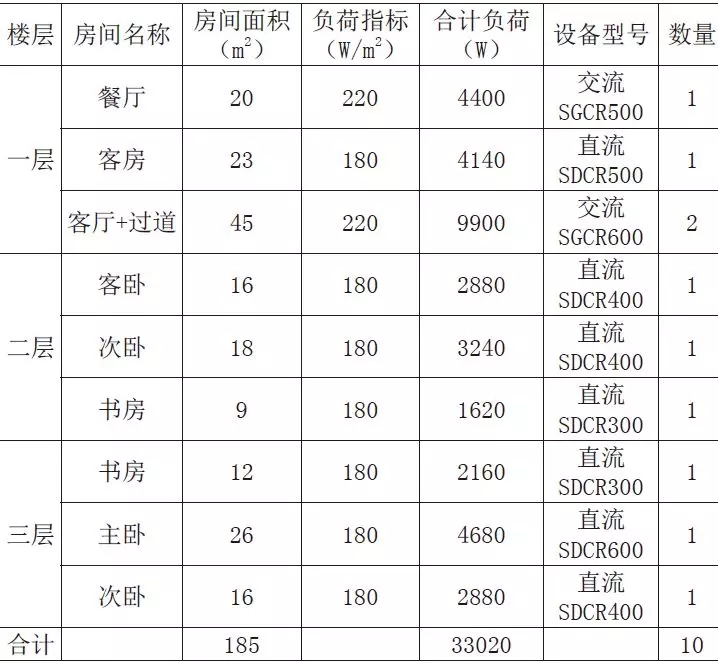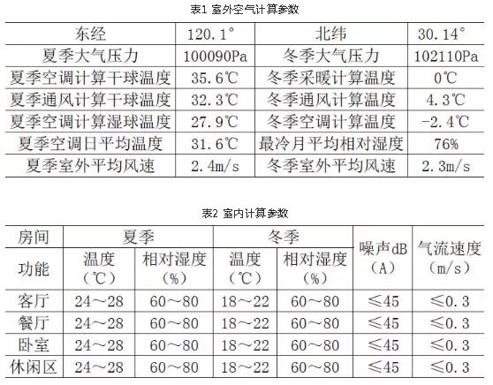冷負荷由人體、燈光、設(shè)備、食物等冷負荷和外圍護結(jié)構(gòu)(外墻、外窗和外門)及內(nèi)圍護結(jié)構(gòu)(內(nèi)墻、內(nèi)窗、內(nèi)門和樓板等)的得熱組成;經(jīng)負荷計算及規(guī)范,參照本地的設(shè)計經(jīng)驗,別墅建筑的空調(diào)冷負荷設(shè)計指標(biāo)為180W/m2~220W/m2。