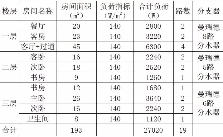 熱負荷由外圍護結(jié)構(gòu)和內(nèi)圍護結(jié)構(gòu)的基本耗熱量及其附加耗熱量和冷空氣滲透耗熱量組成;冬季供暖的室內(nèi)設(shè)計溫度設(shè)為20℃,經(jīng)負荷計算及規(guī)范,參照本地經(jīng)驗,別墅建筑的供暖熱負荷設(shè)計指標(biāo)為140W/m2,符合要求。