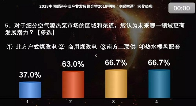 張樹前:我也選了10%以內(nèi)。我非?春空氣源熱泵這個(gè)行業(yè)。公司今年1-8月份的整體銷售情況很好,大概有二十幾個(gè)區(qū)的項(xiàng)目都中標(biāo)了。今年北京的需求量與去年相比少了很多,北京之外的地方政府財(cái)力是影響戶式水機(jī)進(jìn)行大面積推廣的較大障礙。在采暖這塊,我們?cè)趦?nèi)蒙古、山西、河北也都有很大的項(xiàng)目。此外,除了煤改電,我們還積極布局北方的零售渠道和南方的采暖市場,雖然整個(gè)量不是很大,但是增長非常快,這也是我們未來后煤改時(shí)代著重打造的市場增長點(diǎn)。我個(gè)人對(duì)2019年起碼在空氣源熱泵這一塊有堅(jiān)定的信心?紤]到大的背景,我選的是10%以內(nèi)。