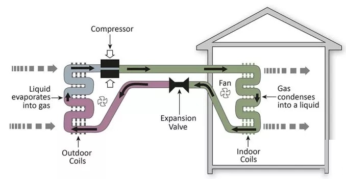 Expansion Valve(膨脹閥)、Outdoor Coils(室外換熱器)、Liquid evaporates into gas(液體蒸發(fā)成氣體)、Compressor(壓縮機(jī))、Fan(風(fēng)扇)、Gas condenses into a liquid(氣體凝結(jié)成液體)、Indoor Coils(室內(nèi)換熱器)