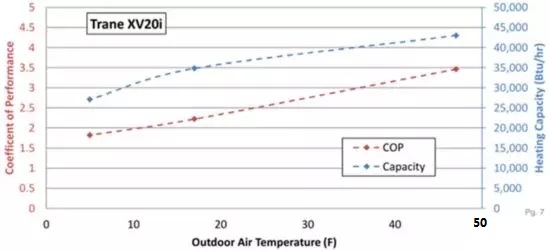 (圖1顯示了由Trane提供的具有報(bào)道的HSPF = 10(NEEP,2014)的XVASHi型號的ccASHP的加熱容量和COP值。)、