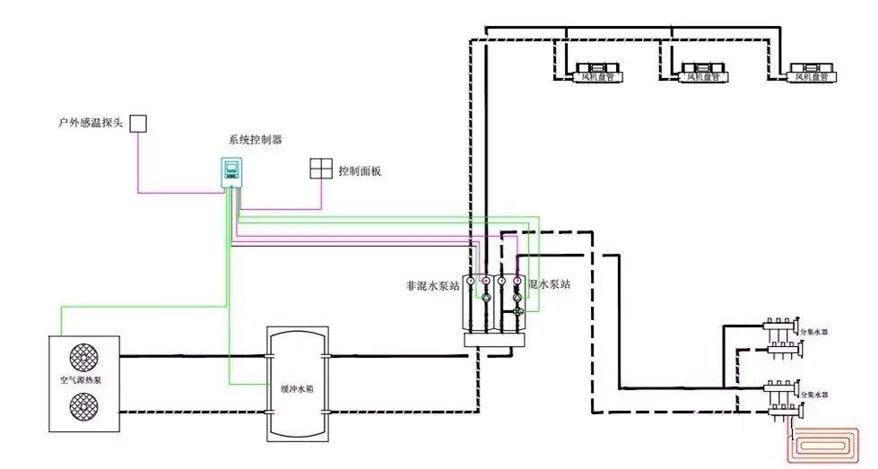 3、在設(shè)計兩聯(lián)供系統(tǒng)時,務(wù)必考慮在水力平衡的前提下,風(fēng)機(jī)盤管和地暖可以同時開啟。