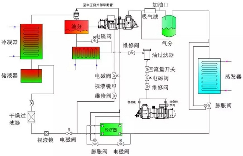 2.技術(shù)原理及工藝單機(jī)雙級(jí)螺桿壓縮超大型空氣源熱泵機(jī)組是一種基于逆卡諾循環(huán)原理建立起來(lái)的節(jié)能、環(huán)保、制熱高效、集熱并轉(zhuǎn)移熱量的裝置。采用單機(jī)雙級(jí)螺桿壓縮技術(shù),使壓縮機(jī)內(nèi)容積產(chǎn)生周期性的容積變化,完成制冷劑氣體的吸入、壓縮和排出,實(shí)現(xiàn)不同高低壓級(jí)間的互換,并通過(guò)與實(shí)際工況合理搭配排量比,達(dá)到機(jī)組最優(yōu)運(yùn)行狀態(tài)。系統(tǒng)原理圖如下: