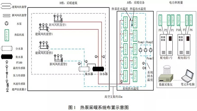 如圖1所示,由于醫(yī)院樓房改造等因素,熱泵機組及其附屬設(shè)備置于A樓樓頂,距離采暖建筑B樓約15m,兩者之間由供回水管連接?諝庠礋岜貌膳到y(tǒng)布置如圖1所示,采暖熱水至采暖建筑B樓分為2路,分別為建筑供暖和新風供暖。