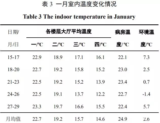 如下表3所示,室外平均干球溫度2.64℃,一/二/三/四樓大廳月平均溫度分別為22.7℃、19.2℃、15.7℃和14.6℃。其中,高樓層大廳用戶窗常開,導致三/四樓大廳室內(nèi)溫度偏低。各樓層病房月平均溫度為:24.9℃。病房人員日間習慣窗戶微開,保持室內(nèi)空氣流通,故日間室內(nèi)溫度存在小范圍波動,室內(nèi)溫度基本不低于20℃。