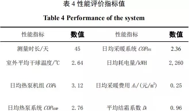 對各采集數(shù)據(jù)綜合分析,整個冬季采暖測試時間:2016年1月19日~3月4日,共45天。總體性能指標如下表4所示,采暖周期內(nèi)平均結(jié)霜系數(shù)為0.96。其中,共有四天結(jié)霜天氣(分別為:1月28日、1月29日、1月31日和2月1日)在換熱器翅片表面有結(jié)霜,結(jié)霜系數(shù)分別為0.96、0.94、0.97和0.98。