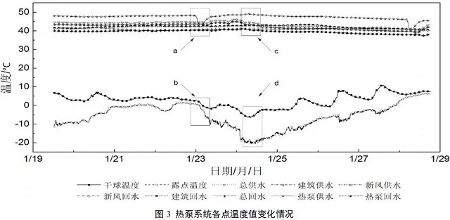 如圖3中c區(qū)域所示,出現(xiàn)測量周期內(nèi)最冷天氣,日平均溫度為-6.90℃,單臺熱泵供水溫度均值48.6℃,系統(tǒng)總供/回水建筑、新風供水、單臺熱泵供/回水溫度均出現(xiàn)下降,而建筑回水和新風回水溫度基本不變,其日均值分別是42.6℃和41.5℃。
