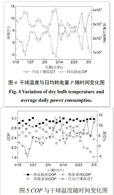 如圖4所示,日均耗電量P與干球溫度呈反比關(guān)系趨勢,測試采暖周期內(nèi)日均耗電量2,260kWH。