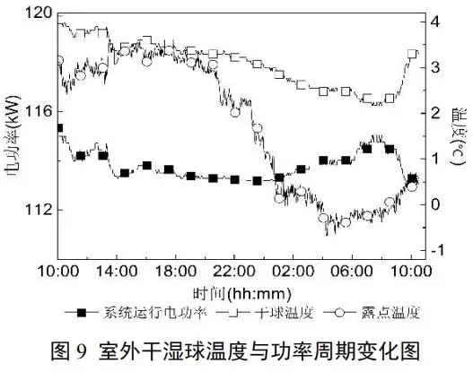 如圖9所示,在結(jié)霜工況下,系統(tǒng)供電總功率維持恒定,在小幅度范圍內(nèi)(113kW-115kW)正常浮動。