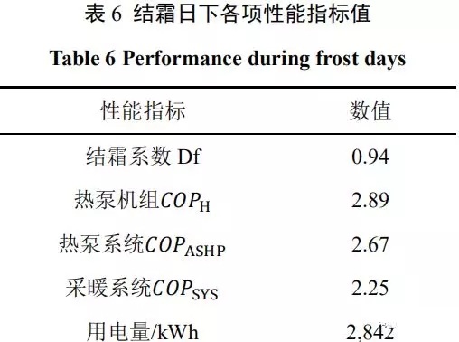 本文選取典型結(jié)霜日(1月29日10:00~1月30日11:00),對熱泵機組在結(jié)霜環(huán)境下工況做進一步分析。結(jié)霜工況下各項性能指標平均值如表6所示: