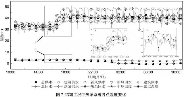 觀察圖7中a和b區(qū)域,16:24時,空氣濕度降低,此時總供水溫度為31.3℃;16:54時,熱泵系統(tǒng)總供水溫度首次達到40.3℃;17:36時,回水溫達到40.2℃,表明熱泵系統(tǒng)開始穩(wěn)定運行,此時環(huán)境溫度3.41℃,露點溫度0.12℃。熱泵系統(tǒng)在結(jié)霜時,可保持總供水溫度保持在33.0℃附近,但達不到設(shè)定值要求溫度(44.0℃)。