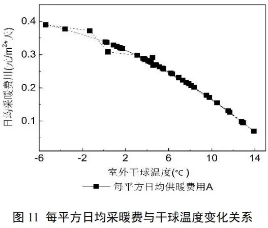 如圖11所示,每平方日均采暖費用和室外干球溫度成反比趨勢。室外干球溫度越高,每平方日均采暖費用越低。