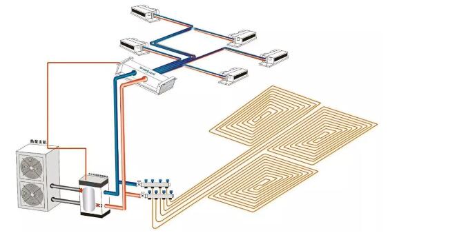 除了提供供暖,空氣源熱泵還有兩聯(lián)供機組。末端系統(tǒng)采用輻射盤管和風(fēng)機盤管,全部室內(nèi)以水為換熱媒介,夏季供冷水,直接采用低溫水送到風(fēng)機盤管進行制冷。冬季供熱水,從室外機直接提供45℃左右熱水供地板采暖。該系統(tǒng)配合緩沖水箱二次系統(tǒng)的穩(wěn)定性和地暖良好的熱穩(wěn)定性,系統(tǒng)整體穩(wěn)定性較高。代替了傳統(tǒng)的“中央空調(diào)制冷+壁掛爐采暖”的家居模式。