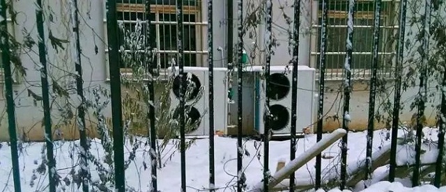 四、定時(shí)查看并清掃室外機(jī)組底座,避免化霜冷凝水排水不暢結(jié)冰或者地面積雪過(guò)厚造成空氣源熱泵被凍。