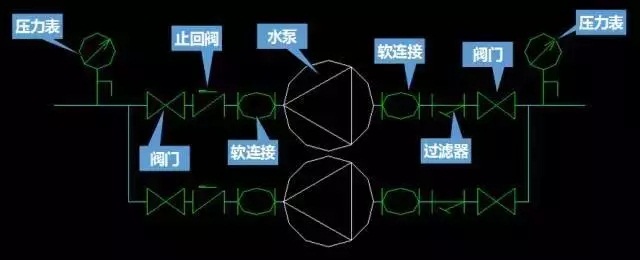 (出水側(cè))閥門—止回閥—軟連接—水泵—軟連接—Y型過濾器—閥門(進(jìn)水側(cè))