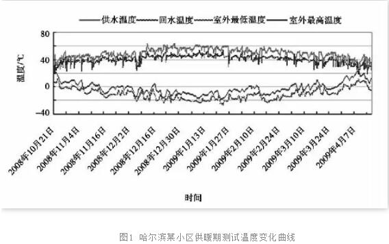 然而,通過對(duì)供暖系統(tǒng)的實(shí)際運(yùn)行調(diào)查,目前北方地區(qū)大多數(shù)城市集中供熱系統(tǒng)運(yùn)行參數(shù),就是在最冷月運(yùn)行參數(shù)也遠(yuǎn)遠(yuǎn)小于設(shè)計(jì)工況。對(duì)北方幾十個(gè)城市調(diào)查結(jié)果是:二次網(wǎng)供水溫度約在47℃~63℃,回水溫度約在40℃~50℃,運(yùn)行溫差約為7.8℃~14.7℃,溫差均小于設(shè)計(jì)溫差20℃。圖1是哈爾濱某小區(qū)測(cè)試整個(gè)供暖季溫度變化曲線,供暖初期供熱溫度低于40℃,最冷天氣供熱溫度為60℃。