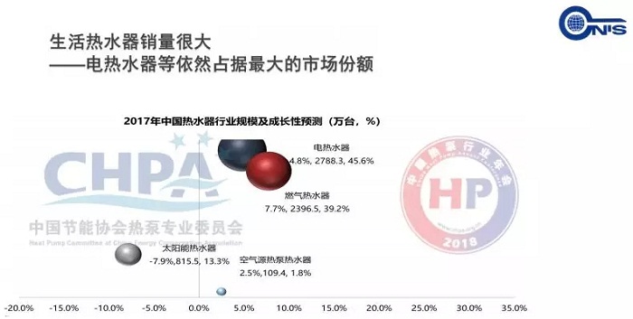下面介紹一下國(guó)內(nèi)外相關(guān)標(biāo)準(zhǔn),據(jù)統(tǒng)計(jì),我國(guó)建筑能耗約占全社會(huì)能耗總量的25%,建筑生活熱水和供暖占建筑能耗總量的約60%,所以說(shuō),熱水和供暖設(shè)備的節(jié)能潛力非常巨大。據(jù)產(chǎn)業(yè)在線統(tǒng)計(jì)報(bào)告顯示,我國(guó)生活熱水器銷(xiāo)量非常大。2017年電熱水器銷(xiāo)售2788.3萬(wàn)臺(tái),占熱水器銷(xiāo)量的45.6%,燃?xì)鉄崴饔?7.7%的增長(zhǎng),空氣源熱泵熱水器有2.5%的增長(zhǎng),銷(xiāo)售109.4萬(wàn)臺(tái),占比1.8%。