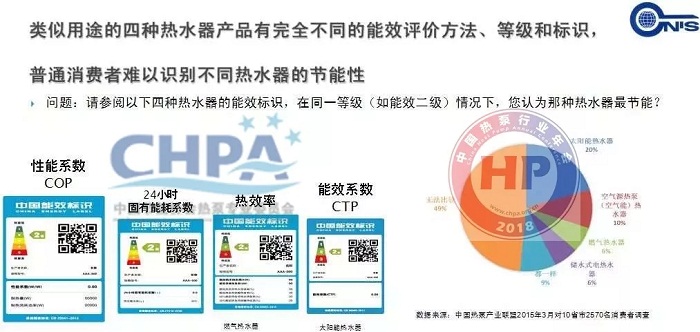依據(jù)國(guó)家能效標(biāo)準(zhǔn),我國(guó)已經(jīng)實(shí)施了燃?xì)鉄崴、電熱水器、太?yáng)能熱水器和熱泵熱水器的能效標(biāo)識(shí),但類(lèi)似用途的四種熱水器產(chǎn)品有完全不同的能效評(píng)價(jià)方法、等級(jí)和標(biāo)識(shí),普通消費(fèi)者難以識(shí)別不同熱水器的節(jié)能性。根據(jù)2015年中國(guó)熱泵產(chǎn)業(yè)聯(lián)盟針對(duì)消費(fèi)者調(diào)查,49%的消費(fèi)者表示只觀察同樣標(biāo)注了2級(jí)的四種產(chǎn)品的標(biāo)識(shí),無(wú)法比較哪一個(gè)產(chǎn)品更節(jié)能。