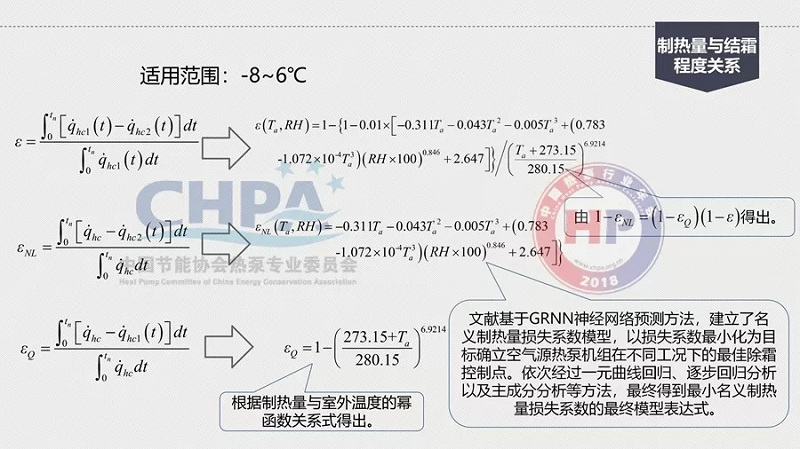 在-15℃到-8℃數(shù)學(xué)模式的圖上可以看到,結(jié)霜的損失系數(shù)用一個(gè)符號(hào)來(lái)代表,結(jié)霜的損失一定影響了它的名義制熱量,所以,它有一個(gè)損失系數(shù),會(huì)影響到整個(gè)制熱量的衰減。有了數(shù)學(xué)模型就可用進(jìn)行數(shù)學(xué)計(jì)算,去解決這樣的物理現(xiàn)象。