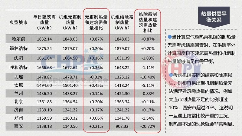 但是實(shí)際上,不是這樣一個(gè)物理現(xiàn)象,結(jié)果是什么?考慮機(jī)組實(shí)際的結(jié)霜和除霜損失,則很容易出現(xiàn)機(jī)組制熱量無(wú)法滿足建筑需熱量的情況。例如大連市制熱量不足的比例超過(guò)10%,西安市超過(guò)20%,這說(shuō)明一旦遇上結(jié)霜比較嚴(yán)重的工況,制熱量不足的現(xiàn)象就會(huì)非常明顯。