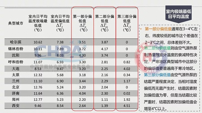 第一部分偏低值通常在3—4℃左右,緯度較低的城市這個(gè)差值在2—3℃之間,總體差別不大;第二部分偏低值則由空氣源熱泵制熱量隨室外溫度的衰減特性決定,嚴(yán)寒地區(qū)典型城市中這部分的偏低值要普遍高于寒冷地區(qū);第三部分偏低值由空氣源熱泵的結(jié)霜嚴(yán)重程度決定,當(dāng)相對(duì)濕度偏低而無(wú)霜產(chǎn)生時(shí),結(jié)霜因素附加偏低值為零,但是當(dāng)結(jié)霜比較嚴(yán)重時(shí),結(jié)霜因素附加偏低值會(huì)增至4℃以上。