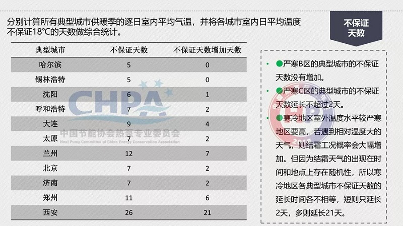 二是嚴(yán)寒B區(qū)典型城市不保證天數(shù)沒(méi)有增加,嚴(yán)寒C區(qū)典型城市不保證天數(shù)增加不超過(guò)2天,寒冷地區(qū)典型城市由于結(jié)霜因素影響,不保證天數(shù)增加天數(shù)各不相等,短則2天,長(zhǎng)則21天。