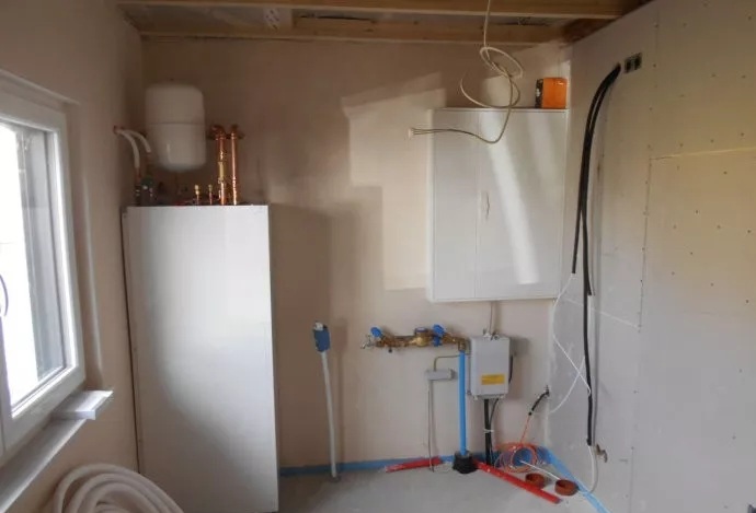 房屋內(nèi)部,設(shè)備間,自來(lái)水、電力、通訊線纜,以及“空氣源熱泵”系統(tǒng)的室內(nèi)主機(jī),安裝現(xiàn)場(chǎng),局部特寫(xiě)。