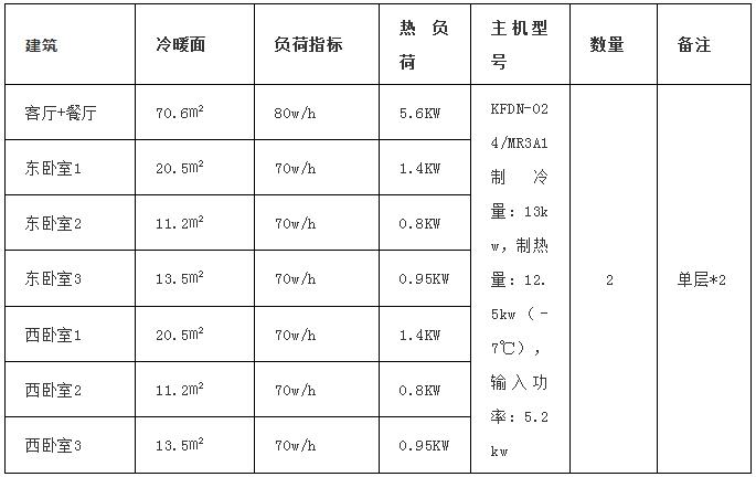根據(jù)計(jì)算,總熱負(fù)荷為23.8KW<25(-7℃),選用超低溫(-25℃)6P恒溫冷暖機(jī)組2臺(tái)。如后期遇到極端天氣、取暖效果不佳或面積增加再進(jìn)行啟動(dòng)水箱電加熱補(bǔ)充。