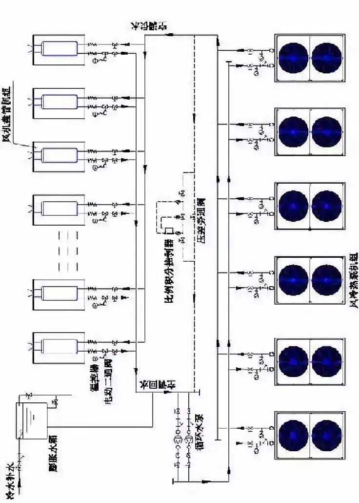 空調(diào)水系統(tǒng)為一次泵變流量、雙管制系統(tǒng),系統(tǒng)干管采用異程式。每層水系統(tǒng)的回水干管上設(shè)置平衡閥。每臺(tái)風(fēng)機(jī)盤(pán)管機(jī)組的回水管上設(shè)計(jì)電動(dòng)二通閥。風(fēng)機(jī)盤(pán)管的供水量控制由室內(nèi)溫控器按所需的室溫來(lái)控制。空調(diào)冷熱水系統(tǒng)定壓補(bǔ)水裝置采用高位的膨脹水箱。