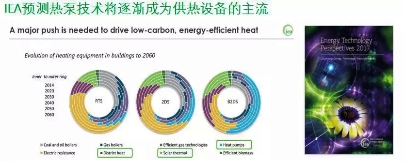 如上圖所示,在國際能源署2017能源技術(shù)展望中指出,自2014年至2060年,隨著年份的不斷推移,空氣源熱泵供熱等(Heat pumps)、太陽能(Solar thermal)、燃氣壁掛爐(Gas boilers)等主要供熱產(chǎn)品所占比重也將會發(fā)生改變,隨著空氣源熱泵供熱等應(yīng)用的逐年增長,在2030年將全球氣候升溫控制在2℃以內(nèi)的總體目標(biāo)就會得到逐步實現(xiàn),甚至超越目標(biāo)。