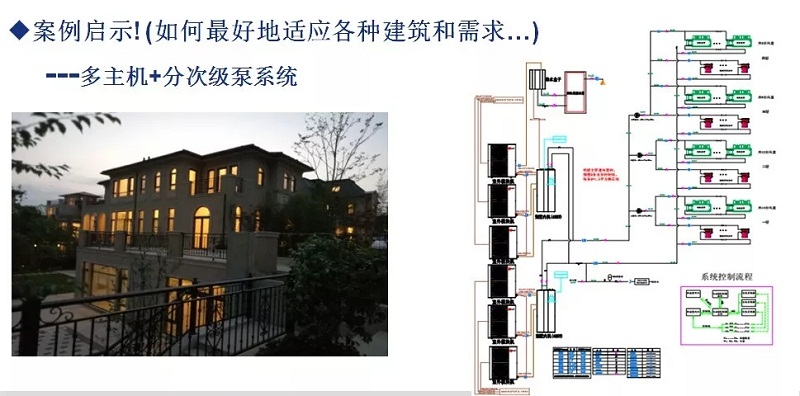 下圖是我們在杭州的一個大別墅案例,就采用了多主機+分次級泵系統(tǒng),空氣源熱泵可以和末端直接通迅對接同時控制對應能力的壓縮機和次級泵的輸出,這里面運用了很多感應的技術,用戶對現(xiàn)在這個系統(tǒng)總體上還是非常滿意的,特別是我們解決了極低負荷下(如只有兩人在家開一個房間的制冷)時,水泵輸送功耗的問題,在大別墅里10%以下的低負荷運行占據90%以上的時間比,因此,低負荷下的能效比對用戶而言就非常關鍵!目前我們的技術平臺完全支持個性化的要求,這是我們智能熱泵能做到的。